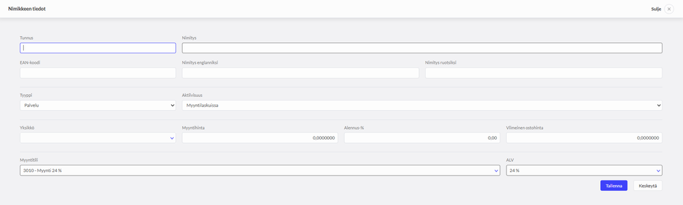 • Aktiivisuus: Valitse, käytetäänkö nimikettä myynti-, osto- vai molemmissa laskuissa.