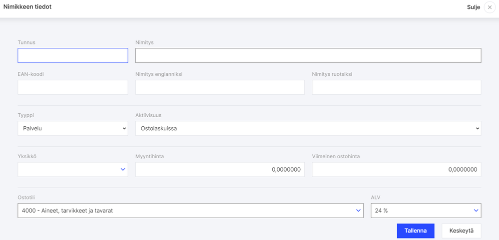 Anna Tunnukseksi lyhyt tunnus, jonka avulla pystyt helposti valitsemaan nimikkeen ostolaskua laatiessasi. Tunnus voi myös olla sama kuin kirjanpitotilin numero.