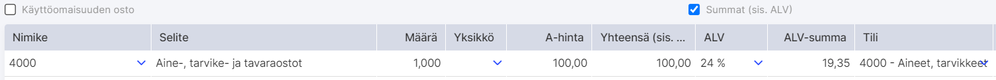 Mikäli kyseessä on käyttöomaisuuden osto myynti ja yrityksellä on käytössä ohjelman Käyttöomaisuuslaskenta, ruksaa laskurivien yläpuolella oleva valintaruutu ja paina: Lisää uusi käyttöomaisuushyödyke (mikäli lisäät kirjanpitoon kokonaan uuden käyttöomaisuushyödykkeen) tai Näytä nimikkeitä (mikäli lisäät arvoa jollekin olemassa olevalle käyttöomaisuushyödykkeelle). Kun lasku tallennetaan, ohjelma lisää kyseisen hyödykkeen käyttöomaisuustilille.