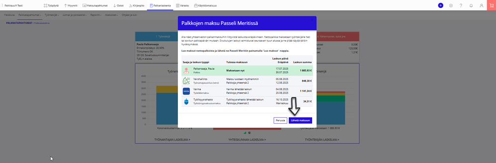 Seuraavassa ikkunassa näet yhteenvedon palkanmaksuun liittyvistä laskuista.