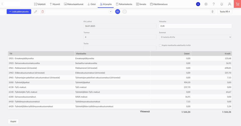 Laskiessasi palkan ohjelmaan integroidulla Palkkaus.fi:llä, saat palkkaukseen liittyvät tiedot kirjanpitoon automaattisesti. Tiedot siirtyvät onnistuneesti, kun olet merkinnyt palkat ensin maksetuksi. Huomioithan, että tiedot ovat nähtävissä kirjanpidossa vasta seuraavan kuukauden ensimmäisenä päivänä.