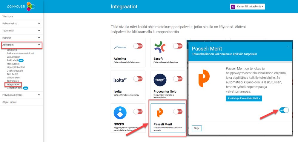 2. Mene kohtaan Aseukset-Integraatiot, klikkaa Passeli Meritin kumppanikorttia, ja ota integraatio käyttöön vierittämällä liukupalkki oikealle ON-asentoon.