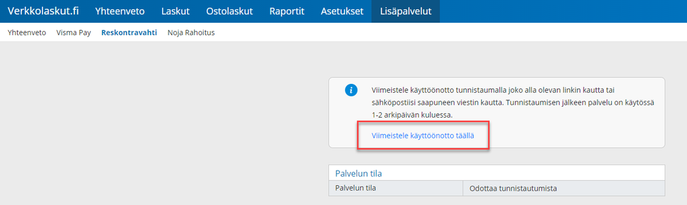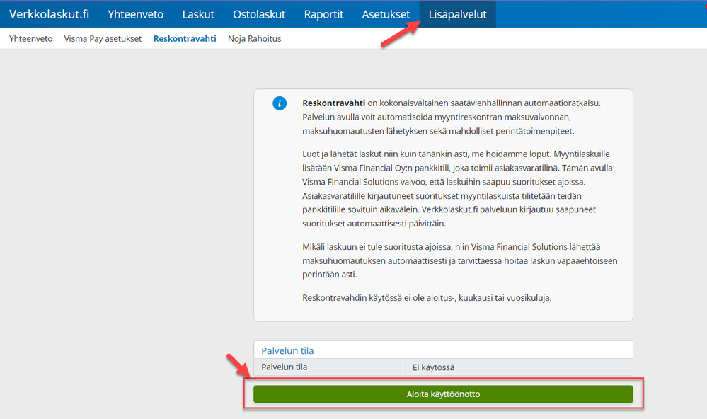 Pääset reskontravahdin ohjattuun käyttöönottoon kohdasta Lisäpalvelut -> Reskontravahti -> Aloita käyttöönotto.