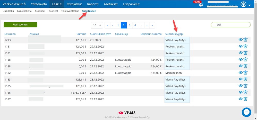 Suorituslistaukseen on lisätty oma Suoritustyyppi maksuille, jotka tulevat Reskontravahdin kautta.