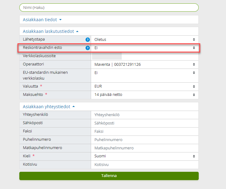 Asiakaskortille on lisätty toiminto Reskontravahdin esto. Jos asiakaskortilla on reskontravahdin esto käytössä, ei laskua siirretä maksuvalvontaan.