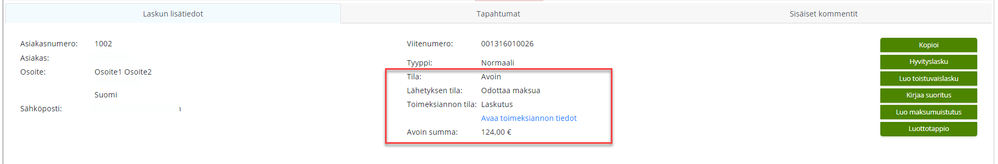 Laskun status (Esim. Odottaa maksua, Huomautettu, Perinnässä) näytetään laskulistauksen laskukortilla. Suoritukset noudetaan 4h välein tasatunnein, ja toimeksiantojen tilat 15min yli.