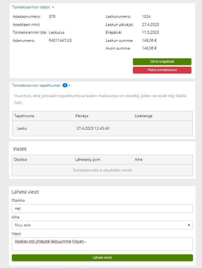 Toimeksiannon tiedot-painikkeesta avautuu tarkemmat tiedot toimeksiannosta. Laskun eräpäivää voidaan siirtää, ja toimeksianto päättää. Myös toimeksiannon tapahtumat ovat nähtävissä tarkemmin. Myös viestittely Visma Amili Oy:n kanssa toimeksiantoon liittyen on mahdollista.