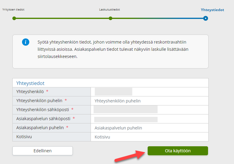Ohjelma täyttää tarvittavat tiedot (Yrityksen tiedot, Laskutustiedot, Yhteystiedot) lomakkeelle automaattisesti yrityksen tietojen perusteella, mutta voit tarvittaessa muuttaa tietoja. Yhteystietojen täyttämisen jälkeen valitse Ota käyttöön.