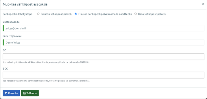 Sähköpostilähetyksessä on mahdollista käyttää vastausosoitteena yrityksen omaa sähköpostia tai määritellä sähköpostilähetykseen kokonaan oman sähköpostipalvelimen. Asetukset näkyvät yrityksen pääkäyttäjälle ja löytyvät "Hallinta"-valikon alta kohdasta "Sähköpostiasetukset".