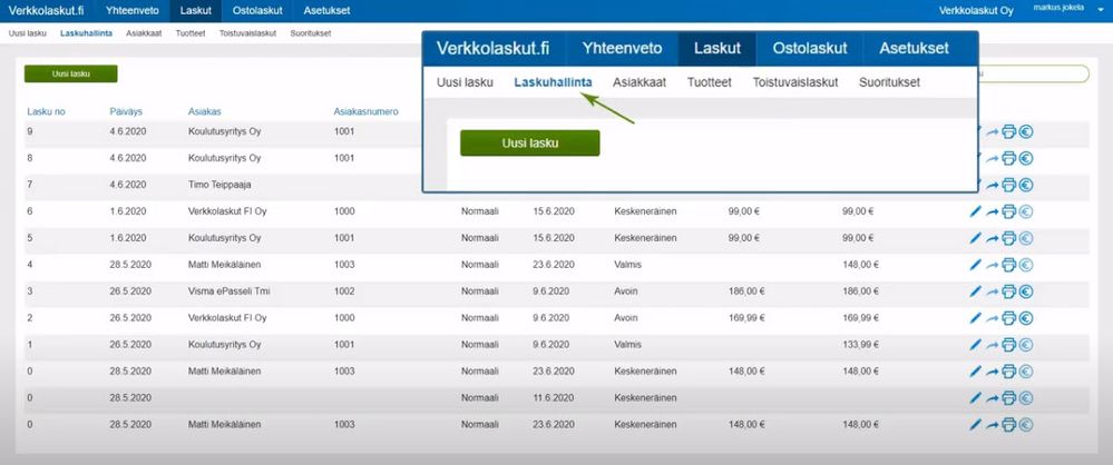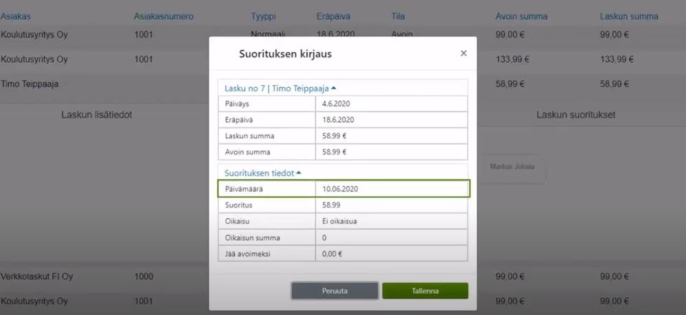 Suorituksen kirjaaminen laskuhallinnassa