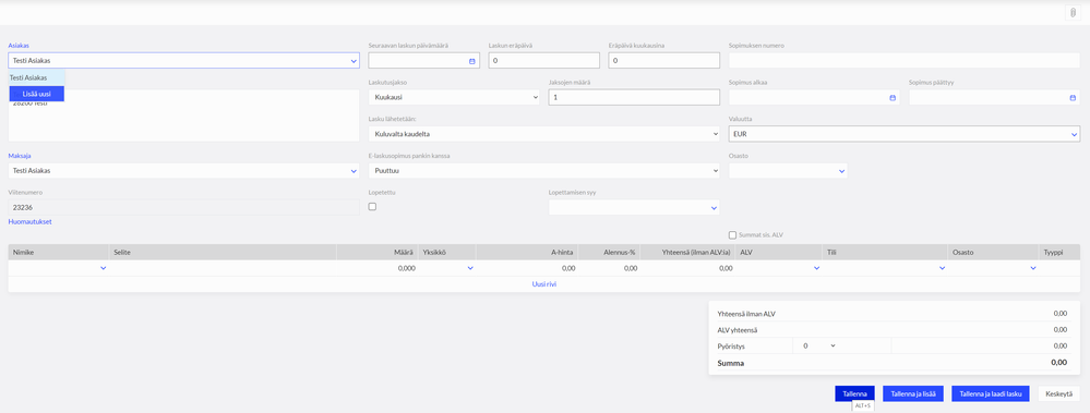 Tallenna valmis lasku ja aloita uuden laskun laatiminen valitsemalla Tallenna ja Lisää.