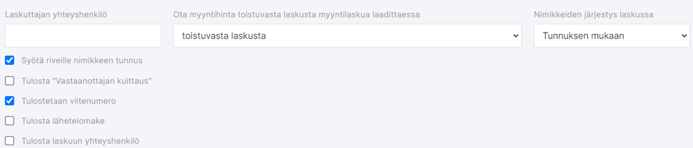 Toistuvista laskuista myyntilaskuja laadittaessa on mahdollista määritellä myyntilaskun asetuksissa (Asetukset > Yleiset asetukset > Myyntilaskun asetukset), laaditaanko myyntilasku toistuvassa laskussa olevan hinnan perusteella vai otetaanko hinta myyntilaskuun myyntihintojen ja alennusten taulukosta.