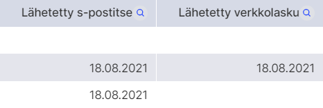 Kun laskut on lähetetty näet lähetyspäivämäärään laskulistauksessa (Myynnit > Myyntilaskut) kentissä: ”Lähetetty s-postitse” ja/tai ”Lähetetty verkkolasku”.