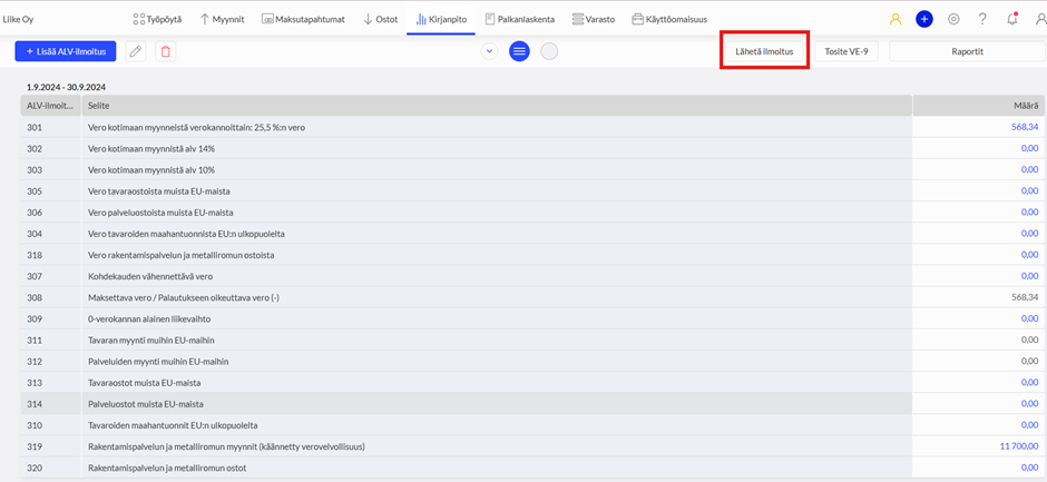 Sen jälkeen voidaan arvonlisäveroilmoitus voidaan lähettää Lähetä ilmoitus -painikkeella.