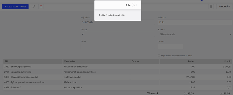 Palkkakirjaus voidaan tuoda myös csv-tiedostona ohjelman pääkirjatosittesiin joko palkkaus.fi tai palkka.fi-palvelusta.