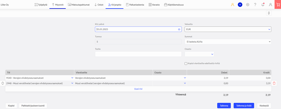 Jotta myös ennakonpidätysvelka- ja työnantajan sairausvakuutusmaksuvelka näkyvät ohjelmassa velkana Verohallinnolle, tulee ohjelmaan syöttää palkkakirjaus valikkoon Kirjanpito > Pääkirjatosite. Kun kirjauksessa käytetään Ennakonpidätysvelka- ja Sairausvakuutusmaksuvelka-tilejä, kyseisille tileille syötetyt summat näkyvät velkana Verohallinnolle sekä raporteissa sekä maksutapahtumissa. Palkkakirjaus voidaan syöttää käsin tai käyttää ohjelmaan integroitua Palkkaus.fi-ohjelmaa. Palkkaus.fi-integraatiolla palkkoja laskettaessa tulee palkkakirjaus ohjelmaan näkyviin seuraavan kuukauden 1. päivänä.