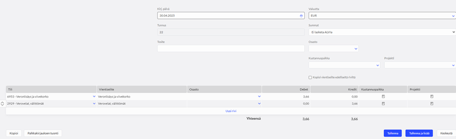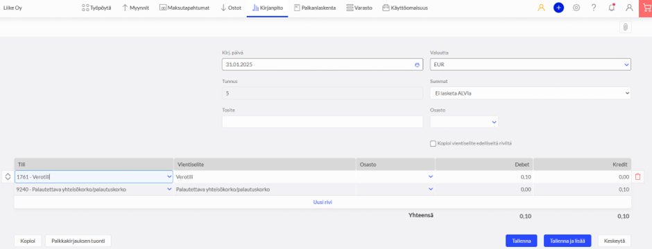 Jos käytät ohjelman pankkiyhteyttä tai luet ohjelmaan tiliotetiedoston, voit kirjata sekä veron että siihen liittyvän hyvitys- tai viivästyskoron samalla kertaa, eikä korosta tarvitse lisätä erillistä pääkirjatositetta.