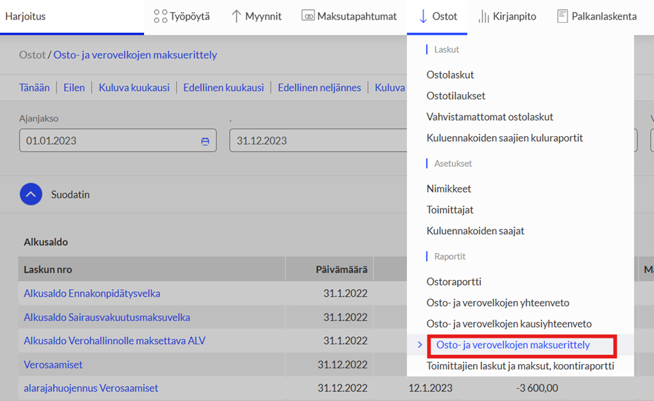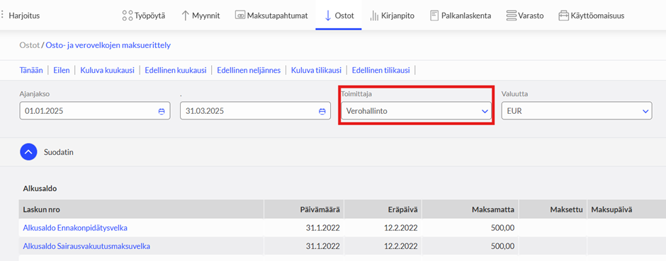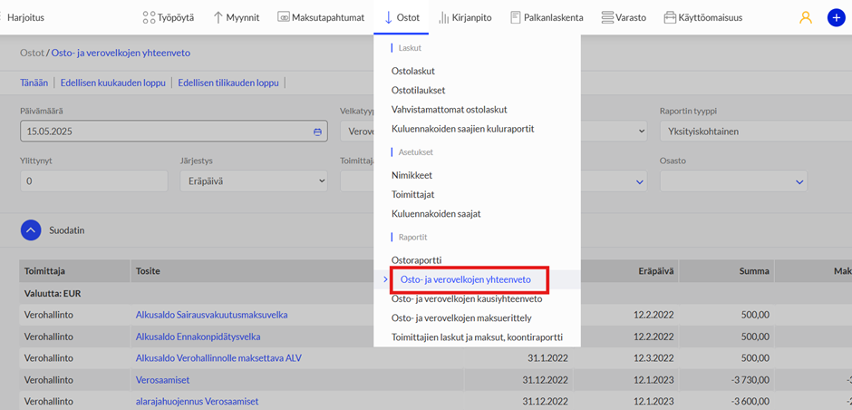 Voit seurata verovelkoja Osto- ja verovelkojen yhteenvetoraportista valitsemalla Velkattyypiksi: Verovelat.