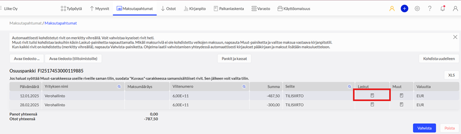 Veroihin liittyviä maksutapahtumia voidaan etsiä Osto- ja verovelkojen maksuerittely -raportista.