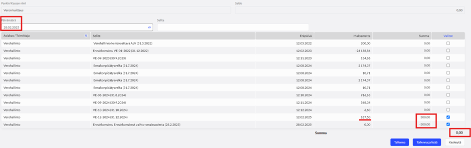 Kuittauksen summaksi tulee muodostua 0 eur, jotta sen voi tallentaa, koska kuittaustositteella kuitataan vain verosaamisia ja -velkoja keskenään. Summa-kentässä voi muokata jotain summaa, jotta kuittauksen summaksi saa muodostettua nollan.