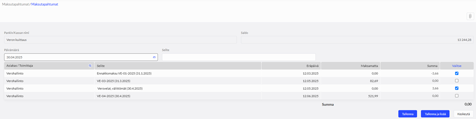 Seuraavaksi tulee tehdä samalle päivälle ns. “verojen keskinäinen kuittaus” valikossa Maksutapahtumat > Maksutapahtumat > Verojen keskinäinen kuittaus. Lisää maksutapahtuma ja syötä sama päivämäärä kuin em. Pääkirjatosittteessa. Avautuu valikko, jossa näkyy pääkirjatositteessa syötetty summa miinusmerkkisenä. Ruksaa se Valitse-ruudusta ja saman verran arvonlisäverovelkaa, jolloin kuittauksen summaksi muodostuu 0. Tallenna.