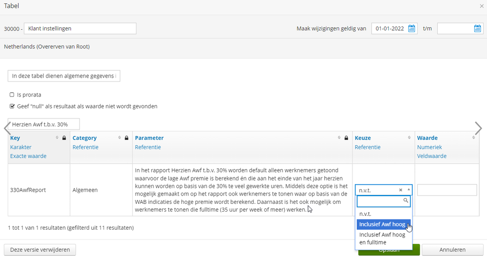 In het rapport worden default alleen werknemers getoond waarvoor de lage Awf premie is berekend én die aan het einde van het jaar herzien kunnen worden op basis van 30% te veel gewerkte uren. Maar we hebben het ook mogelijk gemaakt om werknemers waarvoor op basis van de WAB indicaties de Awf hoge premie wordt berekend en/of werknemers die als fulltime worden beschouwd toe te voegen aan het rapport.