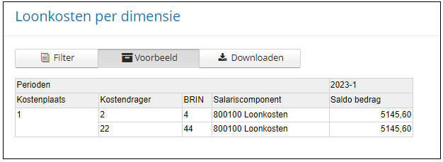 Genereer je dit rapport dan krijg je een loonkosten rapport waarop de loonkosten zijn uitgesplitst over alle dimensies die er binnen je administratie aanwezig zijn. Wanneer er binnen jouw administratie bijvoorbeeld een kostenplaats en kostendrager als dimensie voorkomen zal het rapport het zo uit zien: