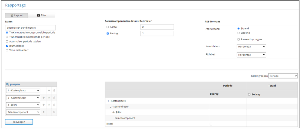 Als voorbeeld hebben we een standaard rapport Loonkosten per dimensie aan het systeem toegevoegd. In dit rapport staan alle hierboven benoemde instellingen geselecteerd. Waarbij in de selectie van de Rij groepen alle te gebruiken dimensies binnen het systeem zijn voorgeselecteerd.