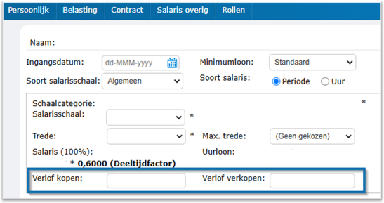 In HRM heb je bij Persoonsgegevens → Contract → Periode salaris de mogelijkheid om handmatig een Verlof kopen en Verlof verkopen uurloon in te geven. Als er een uurloon is ingevuld dan is dat opgegeven uurloon leidend. Wel wordt het opgegeven uurloon verhoogd als er een toevoeging op het uurloon moet plaatsvinden. Bijvoorbeeld als bij een persoonlijke toeslag is aangegeven dat het grondslag is voor het uurloon.
