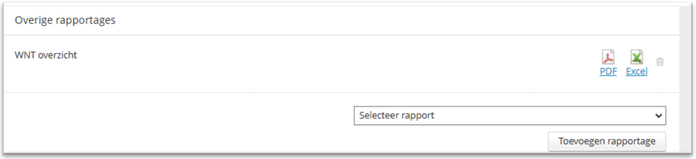 Actie: Open de salarisrun → stap Rapportages en betalen → Overige rapportages → klik op de knop Toevoegen rapportage → selecteer WNT overzicht → klik op de PDF of Excel link om het overzicht te downloaden