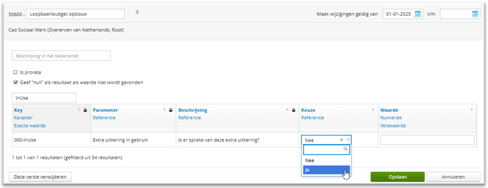 Op cao Sociaal werk niveau hebben we het loopbaanbudget nu toegevoegd. Default staat het loopbaanbudget uit. Dit hebben we gedaan aangezien de meeste klanten op dit moment eigen oplossingen gebruiken om het loopbaanbudget te beheren. Wil je het loopbaanbudget berekenen en beheren in Payroll, dan vind je verderop in de beschrijving welke stappen je moet doorlopen.