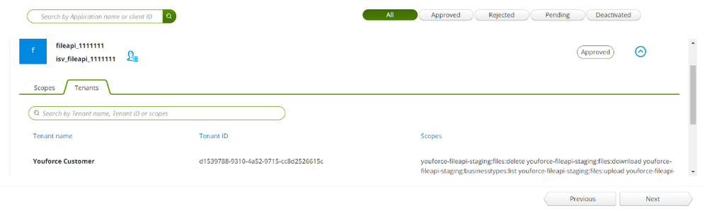 Binnen het beheer van je applicatie en het scherm Integrations is via de tabblad Tenants (default wordt het tabblad Scopes getoond) terug te zien welke klanten (tenants) gekoppeld zijn aan je applicatie. Dit scherm laat ook de bijbehorende TenantID zien. De TenantID is benodigd bij het opvragen van de authenticatie token.