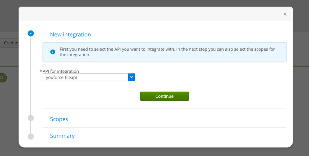 Via het tabblad Integrations selecteer je Youforce File (voor de bestanden), oftewel je ‘basis’ API, je gebruikt hiervoor New integration.