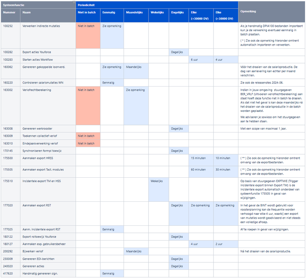 In de onderstaande tabel zie je de meest toegepaste batchfuncties en de daarbij behorende periodiciteit. In sommige gevallen is de gewenste periodiciteit afhankelijk van de grootte van de organisatie. Dit heeft te maken met de balans tussen de gemiddelde mutatiegraad en de toegevoegde waarde van het uitvoeren van die batchopdracht. Die grens is gesteld op 30000 dienstverbanden (DV) inclusief de dienstverbanden uit dienst.