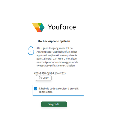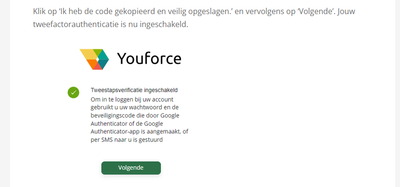 Klik op ‘Ik heb de code gekopieerd en veilig opgeslagen.’ en vervolgens op ‘Volgende’. Jouw tweefactorauthenticatie is nu ingeschakeld.