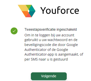 * De uitgevoerde stappen zijn eenmalig. De volgende keer dat je inlogt in Mijn Youforce log je in met jouw gebruikersnaam, wachtwoord en de push notificatie uit de Visma Authenticator