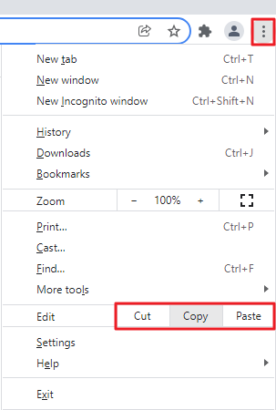 In Google Chrome zitten de opties Knippen, Kopiëren en Plakken in het menu dat verschijnt na het klikken op de drie puntjes:
