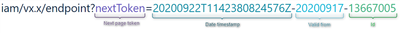 The IAM API supports pagination with the help of a nextToken. With the help of the following properties: dateTime, validFrom and id a “bookmark“ is generated ensuring no records are “lost“ when skipping through pages. Below a breakdown of the nextToken url generated at the end of the response body.