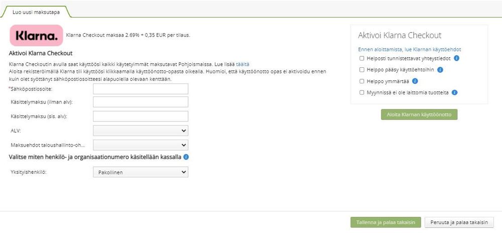 Jotta asiakkaasi voivat maksaa Klarnalla verkkokaupassasi, pitää sinun luoda Klarnalle tili. Tämä tehdään Visma Verkkokauppa +-palvelussa, kun lisäät Klarnan maksutavaksi.