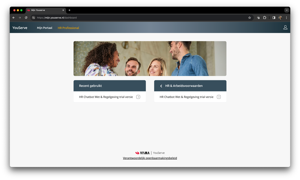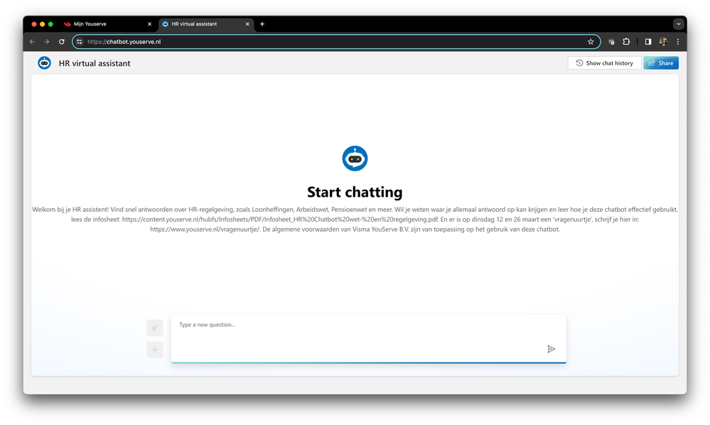 De HR chatbot vind je in Mijn YouServe exclusief voor de HR-professional. Mijn YouServe is dé nieuwe startpagina voor al jouw HR taken waarmee we jouw HR leven nog makkelijker maken. Zoals eerder bericht kun je vanaf 1 februari 2024 als HR-professional na het inloggen direct gebruikmaken van deze nieuwe Mijn YouServe omgeving.