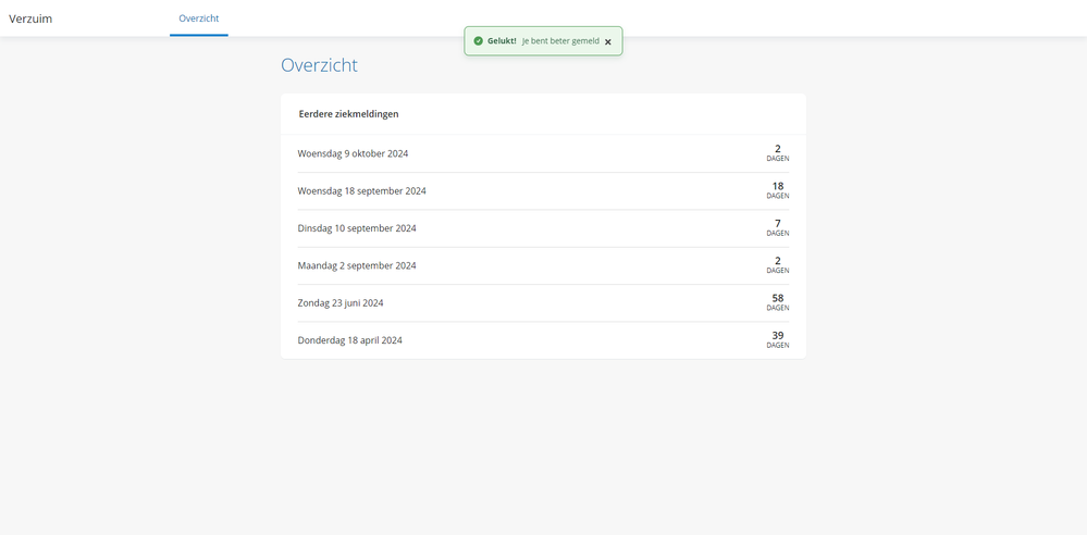 Na het afronden keert de medewerker terug naar het eigen verzuimoverzicht met een bevestiging dat de herstelmelding is ingevoerd.
