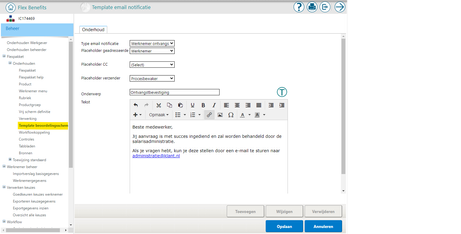 Je kunt eventueel de inhoud van de e-mailberichten per doel/product aanpassen in Flex Benefits, via de onderstaande procedure. Je kunt bijvoorbeeld een zin toevoegen waarin je aangeeft via welk e-mailadres medewerkers een vraag kunnen stellen.