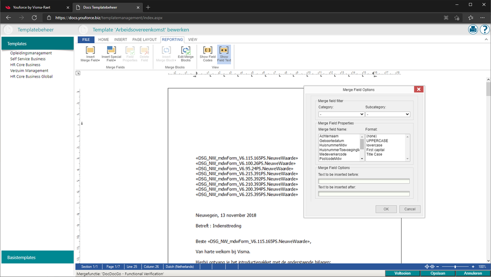 Het uiterlijk van de nieuwe template editor sluit meer aan bij wat je gewend bent in bijvoorbeeld Microsoft Word. De kleuren en icoontjes herken je daardoor sneller en het werken in deze versie is veel gebruiksvriendelijker. Zo is de manier van het toevoegen van samenvoegvelden vereenvoudigd net als het werken met IF-expressies.