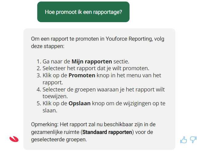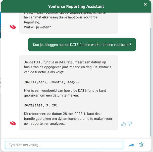 Het is je ongetwijfeld niet ontgaan dat AI een grote vlucht neemt in het dagelijks leven. Ook binnen Youforce kunnen wij daarin natuurlijk niet achterblijven. Daarom introduceren wij binnen Youforce Reporting onze AI gestuurde Youforce Assistent. Met de Youforce Assistent krijg je op een menselijke manier antwoord op al je vragen over Reporting. Met informatie uit onze handleidingen en andere documentatie, weet de Assistent snel en doeltreffend te vinden wat je nodig hebt.
