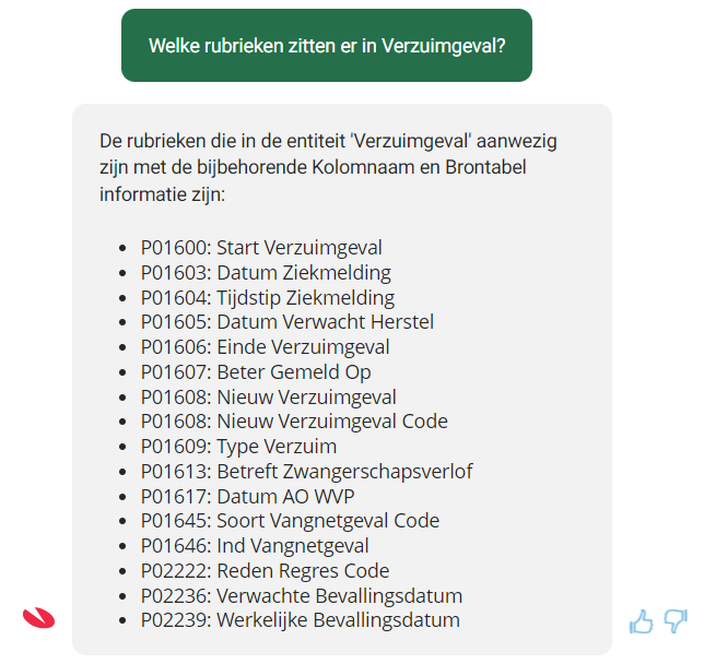 Het is mogelijk om direct feedback te geven over de antwoorden die je krijgt van de assistent. Bij ieder antwoord heb je namelijk de mogelijkheid om op het duimpje omhoog of duimpje omlaag te klikken. Op basis van deze feedback zorgen wij ervoor dat de assistent in ontwikkeling blijft en jou de antwoorden blijft geven die je verwacht.