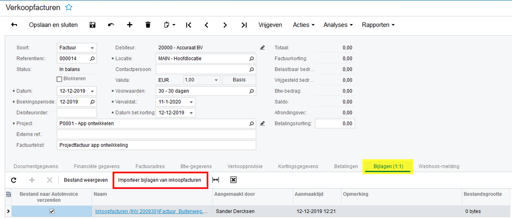 In het venster Verkoopfacturen is op het tabblad Bijlagen de optie Importeren bijlagen van gekoppelde inkoopfacturen beschikbaar gemaakt. Hiermee kunt u een overzicht van bijlagen opvragen van alle inkoopfacturen die voor het gekoppelde project zijn verwerkt. Door het markeren van deze bijlagen kunt u deze overnemen in de verkoopfactuur en wanneer u deze via Visma.net AutoInvoice verstuurd worden de bijlagen automatisch meegestuurd naar uw klant.