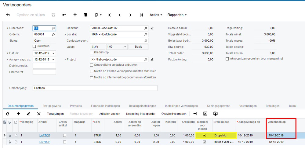 Wanneer u inkooporders aanmaakt op basis van de verkooporders en gebruik maakt van de optie voor dropshipment, dan zijn de leverdata van de inkooporder en verkooporder nu aan elkaar gekoppeld.