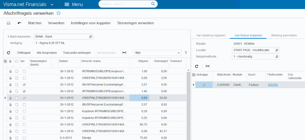 Bij het verwerken van de afschriftregels zal de transactie altijd geboekt worden op de vestiging die is gekoppeld aan de bank-/kasrekening in plaats van de op dat moment gekozen vestiging in de rechter-bovenhoek). Daarbij is nu de vestiging als alleen-lezen veld zichtbaar gemaakt in het venster Afschriftregels verwerken, zodat altijd duidelijk is in welke vestiging de transacties verwerkt wordt.