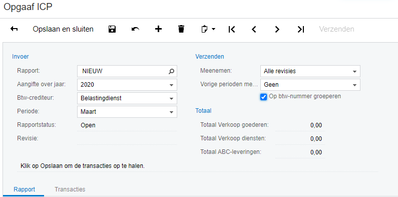 Let op: bij het toevoegen van een nieuwe aangifte kiest u eerst voor Opslaan nadat de parameters zijn ingevuld. Na het opslaan verschijnen de transacties in de aangifte.