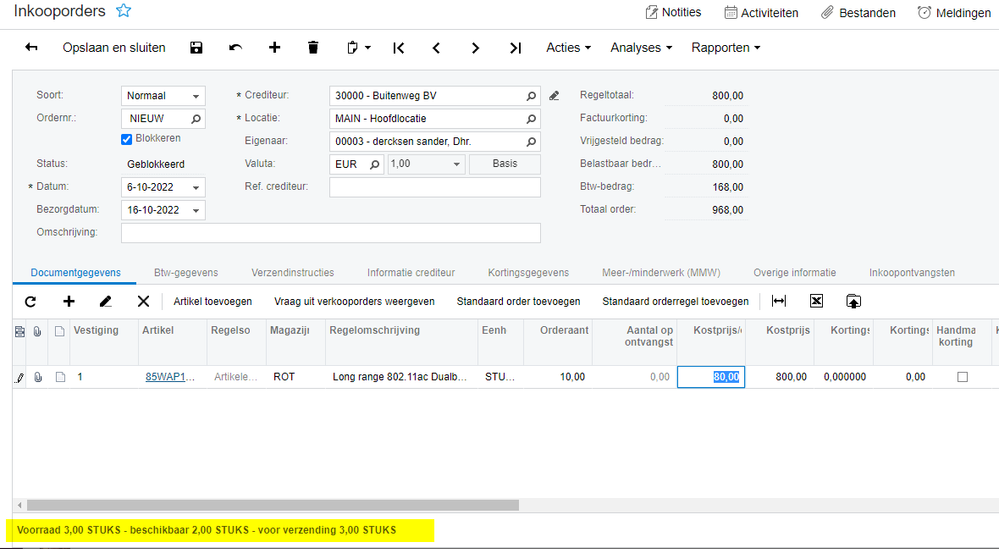 Het is nu mogelijk om direct in het venster Inkooporders per orderregel de voorraadinformatie van het artikel in te zien, net zoals in het venster Verkooporders. Het is hierdoor niet meer nodig om tijdens het bestellen andere vensters te moeten openen om daarin de aanwezige voorraad te kunnen raadplegen.